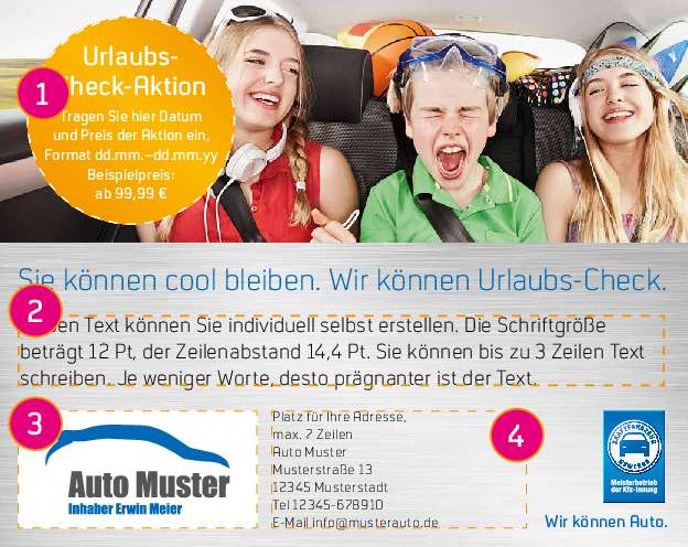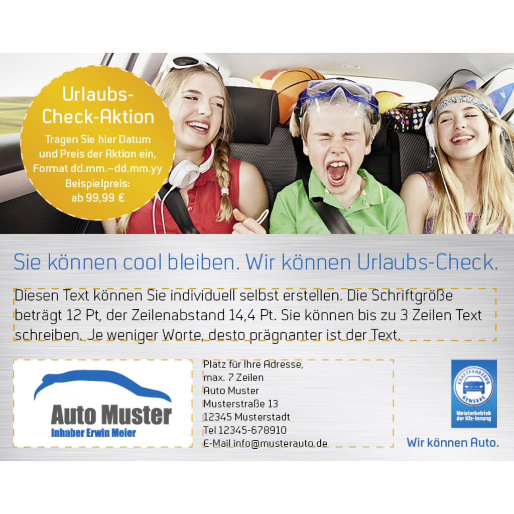 Diese Anzeige zeigt das Meisterschild mit der Aufschrift „Meisterbetrieb der Kfz-Innung“. Wenn Sie die Vorlage nutzen, muss Ihr Unternehmen also Innungsmitglied sein. [weiterlesen] [einklappen]