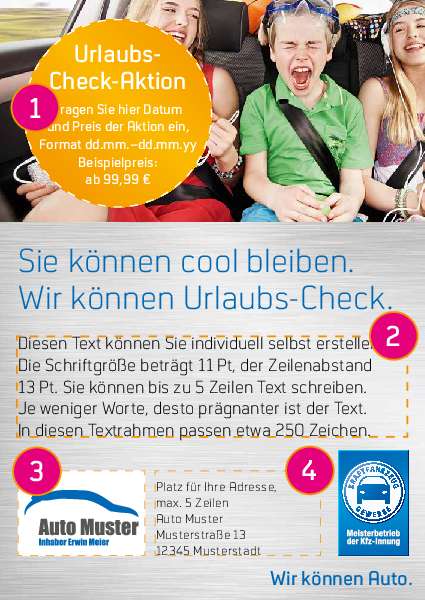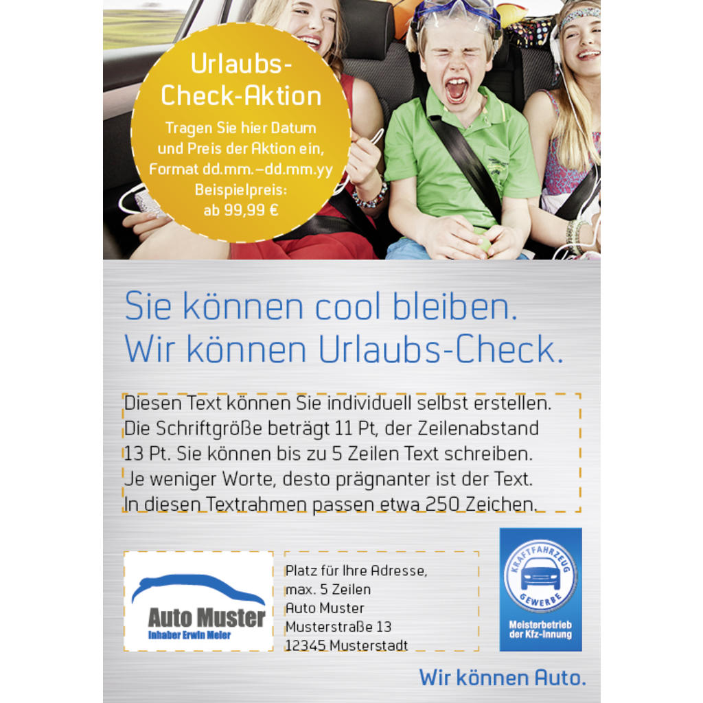 Diese Anzeige zeigt das Meisterschild mit der Aufschrift „Meisterbetrieb der Kfz-Innung“. Wenn Sie die Vorlage nutzen, muss Ihr Unternehmen also Innungsmitglied sein. [weiterlesen] [einklappen]
