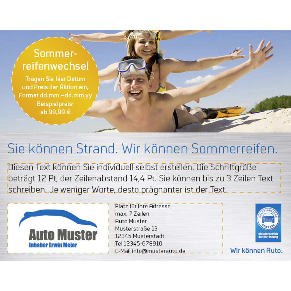 Diese Anzeige zeigt das Meisterschild mit der Aufschrift „Meisterbetrieb der Kfz-Innung“. Wenn Sie die Vorlage nutzen, muss Ihr Unternehmen also Innungsmitglied sein. [weiterlesen] [einklappen]