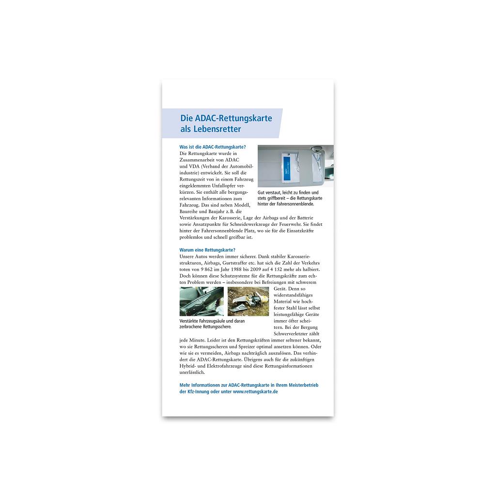 Die ADAC-Rettungskarte bietet Kfz-Betrieben eine weitere Chance, sich als Sicherheitspartner der Autofahrer zu positionieren. Die Rettungskarte, die hinter der Sonnenblende über dem Fahrersitz steckt, informiert Rettungskräfte bei einem Unfall schnell, wo das verunglückte Fahrzeug geöffnet werden kann. [weiterlesen] [einklappen]