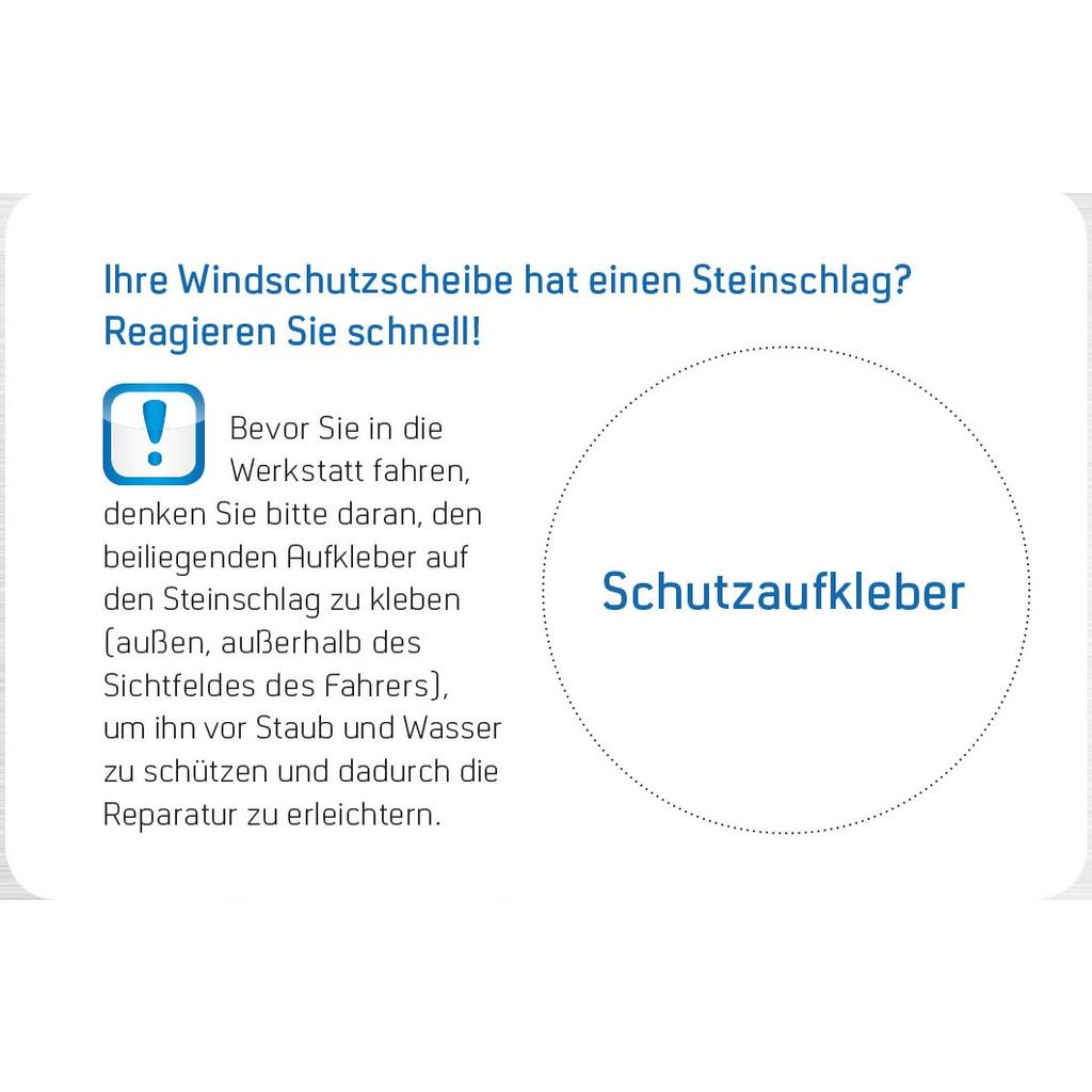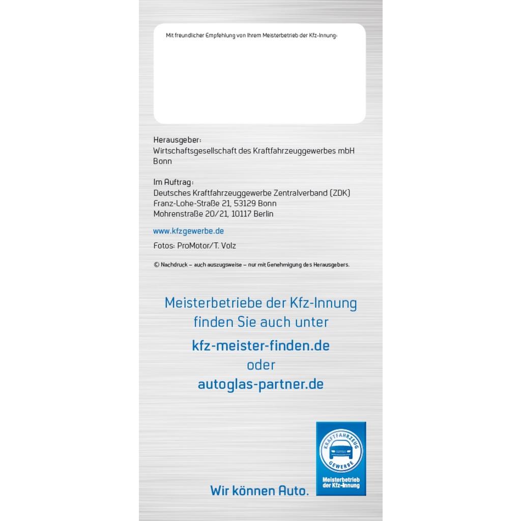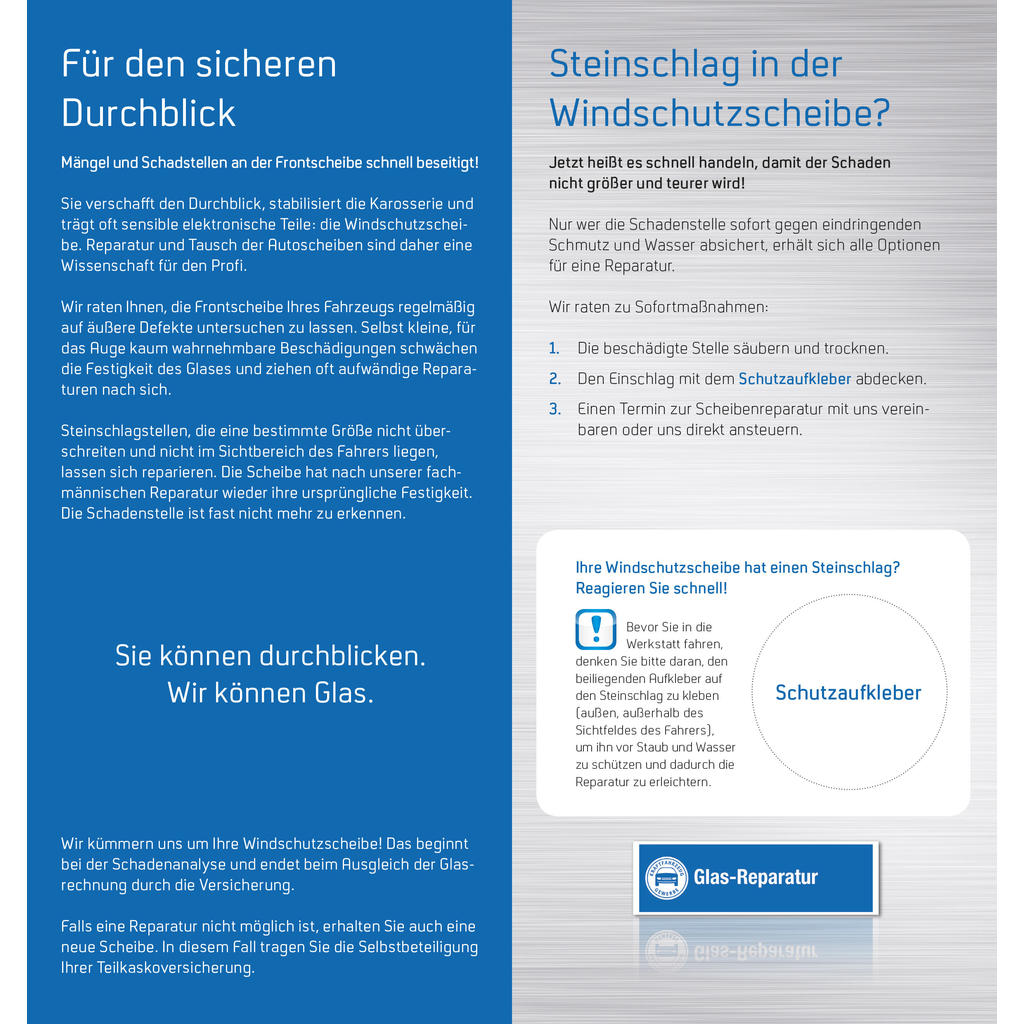 Der Flyer ist für den Notfall mit einer austrennbaren Karte inkl. Scheibenpflaster (Schutzaufkleber für Steinschlagschaden) ausgestattet. [weiterlesen] [einklappen]