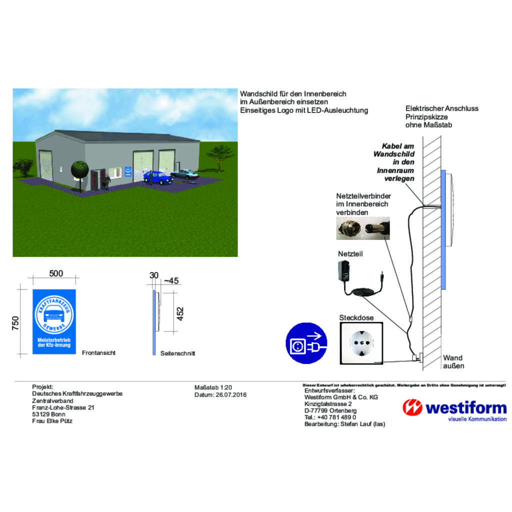 Ausleuchtung mittels LED, 12V-Technik inkl. 2 mtr. Kabel am Schild und 5 mtr. Zuleitung mit Steckernetzteil (LED-Power-Adapter),